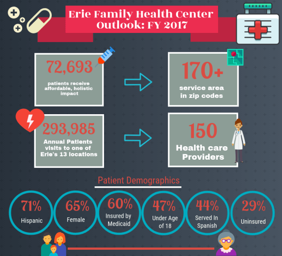 Although Erie serves mainly low-income individuals (90 percent happen to live in poverty), all are welcome. In order to better attend those who seek medical services, “being bilingual is a requirement for all personnel,” said Linda. An astounding 60 different languages have been used – some through translator lines. If that weren’t enough, Erie is famous for being a leader in integration. This is an added benefit to patients as there are personnel on-site who can provide immediate intervention such as mental, behavioral, and dental.